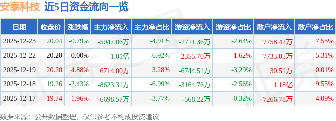 证券之星消息,截至2025年12月23日收盘,安泰科技(000969)报收于20.04元,下跌0.79%,换手率4.95%,成交量51.13万手,成交额10.28亿元。