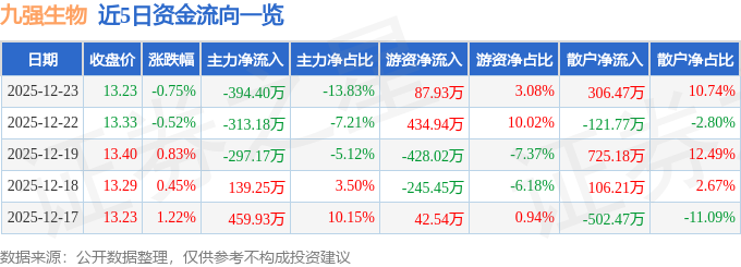 证券之星消息,截至2025年12月23日收盘,九强生物(300406)报收于13.23元,下跌0.75%,换手率0.51%,成交量2.15万手,成交额2852.67万元。
