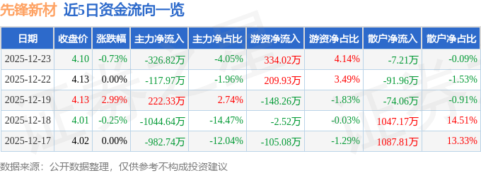 证券之星消息,截至2025年12月23日收盘,先锋新材(300163)报收于4.1元,下跌0.73%,换手率4.33%,成交量19.67万手,成交额8076.47万元。