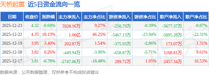 证券之星消息,截至2025年12月23日收盘,天桥起重(002523)报收于4.32元,下跌0.69%,换手率10.55%,成交量148.94万手,成交额6.4亿元。