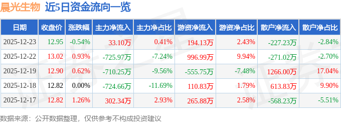 证券之星消息,截至2025年12月23日收盘,晨光生物(300138)报收于12.95元,下跌0.54%,换手率1.55%,成交量6.17万手,成交额7993.01万元。