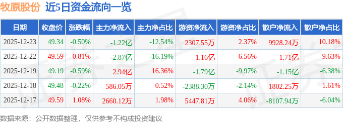 证券之星消息,截至2025年12月23日收盘,牧原股份(002714)报收于49.34元,下跌0.5%,换手率0.52%,成交量19.71万手,成交额9.75亿元。