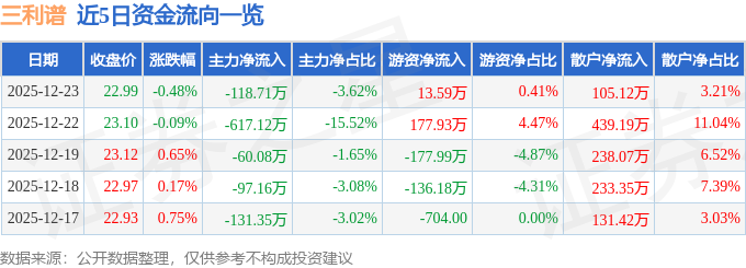 12月23日的资金流向数据方面,主力资金净流出118.71万元,占总成交额3.62%,游资资金净流入13.59万元,占总成交额0.41%,散户资金净流入105.12万元,占总成交额3.21%。