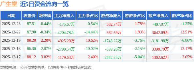 证券之星消息,截至2025年12月23日收盘,广生堂(300436)报收于87.51元,下跌0.44%,换手率2.72%,成交量3.71万手,成交额3.27亿元。