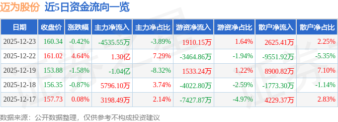 证券之星消息,截至2025年12月23日收盘,迈为股份(300751)报收于160.34元,下跌0.42%,换手率3.76%,成交量7.27万手,成交额11.66亿元。