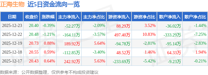 证券之星消息,截至2025年12月23日收盘,正海生物(300653)报收于20.4元,下跌0.39%,换手率0.68%,成交量1.23万手,成交额2506.87万元。