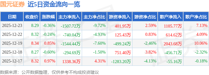 证券之星消息,截至2025年12月23日收盘,国元证券(000728)报收于8.29元,下跌0.36%,换手率0.43%,成交量18.62万手,成交额1.55亿元。