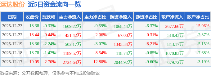 证券之星消息,截至2025年12月23日收盘,运达股份(300772)报收于18.38元,下跌0.33%,换手率1.3%,成交量9.08万手,成交额1.68亿元。