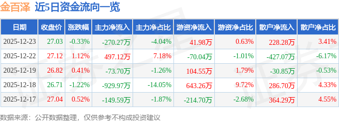 证券之星消息,截至2025年12月23日收盘,金百泽(301041)报收于27.03元,下跌0.33%,换手率3.15%,成交量2.48万手,成交额6693.16万元。
