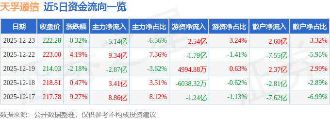 证券之星消息,截至2025年12月23日收盘,天孚通信(300394)报收于222.28元,下跌0.32%,换手率4.54%,成交量35.2万手,成交额78.33亿元。