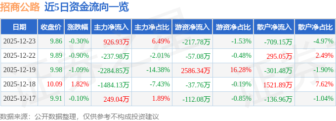 证券之星消息,截至2025年12月23日收盘,招商公路(001965)报收于9.86元,下跌0.3%,换手率0.21%,成交量14.43万手,成交额1.43亿元。
