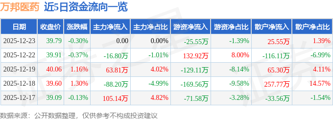 证券之星消息,截至2025年12月23日收盘,万邦医药(301520)报收于39.79元,下跌0.3%,换手率2.06%,成交量4626.0手,成交额1842.47万元。