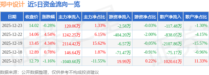 证券之星消息,截至2025年12月23日收盘,郑中设计(002811)报收于14.02元,下跌0.28%,换手率2.28%,成交量6.45万手,成交额9055.35万元。
