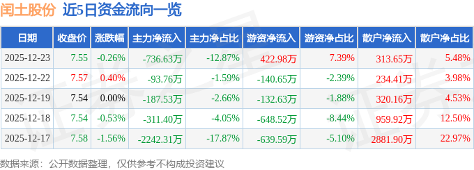证券之星消息,截至2025年12月23日收盘,闰土股份(002440)报收于7.55元,下跌0.26%,换手率0.8%,成交量7.58万手,成交额5724.75万元。