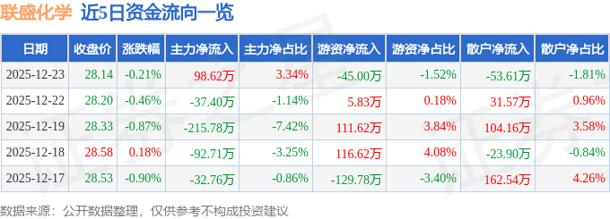 证券之星消息,截至2025年12月23日收盘,联盛化学(301212)报收于28.14元,下跌0.21%,换手率1.13%,成交量1.06万手,成交额2954.79万元。