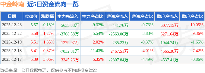 证券之星消息,截至2025年12月23日收盘,中金岭南(000060)报收于5.57元,下跌0.18%,换手率2.43%,成交量108.08万手,成交额6.05亿元。