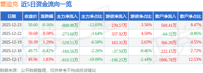 证券之星消息,截至2025年12月23日收盘,雷迪克(300652)报收于50.6元,下跌0.16%,换手率1.11%,成交量1.32万手,成交额6723.7万元。