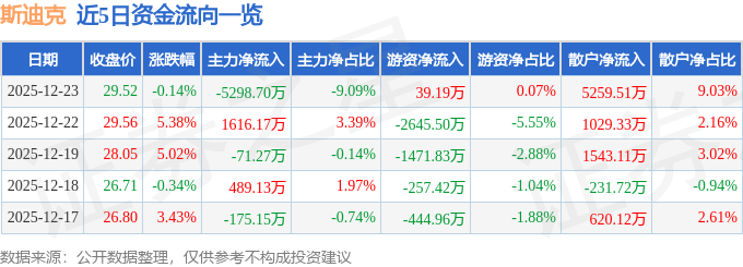 证券之星消息,截至2025年12月23日收盘,斯迪克(300806)报收于29.52元,下跌0.14%,换手率6.21%,成交量19.64万手,成交额5.83亿元。