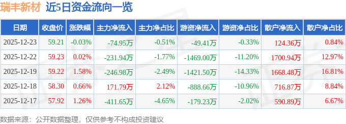 证券之星消息,截至2025年12月23日收盘,瑞丰新材(300910)报收于59.21元,下跌0.03%,换手率1.19%,成交量2.47万手,成交额1.48亿元。