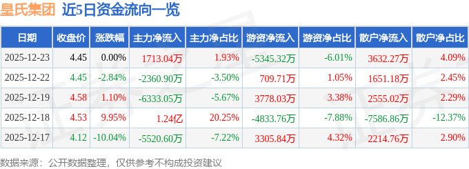 证券之星消息,截至2025年12月23日收盘,皇氏集团(002329)报收于4.45元,上涨0.0%,换手率29.32%,成交量190.71万手,成交额8.89亿元。