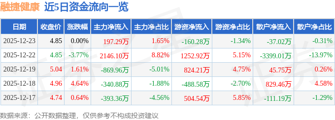 证券之星消息,截至2025年12月23日收盘,融捷健康(300247)报收于4.85元,上涨0.0%,换手率3.07%,成交量24.68万手,成交额1.2亿元。