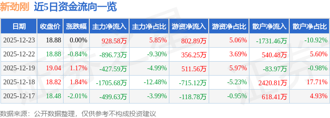 证券之星消息,截至2025年12月23日收盘,新劲刚(300629)报收于18.88元,上涨0.0%,换手率3.84%,成交量8.33万手,成交额1.59亿元。