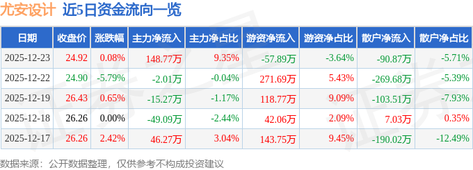 证券之星消息,截至2025年12月23日收盘,尤安设计(300983)报收于24.92元,上涨0.08%,换手率0.54%,成交量6373.0手,成交额1590.59万元。