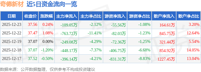 证券之星消息,截至2025年12月23日收盘,奇德新材(300995)报收于37.56元,上涨0.24%,换手率2.29%,成交量1.37万手,成交额5149.81万元。