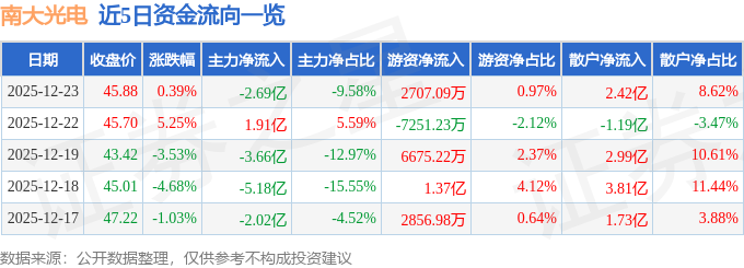 证券之星消息,截至2025年12月23日收盘,南大光电(300346)报收于45.88元,上涨0.39%,换手率9.27%,成交量60.84万手,成交额28.02亿元。