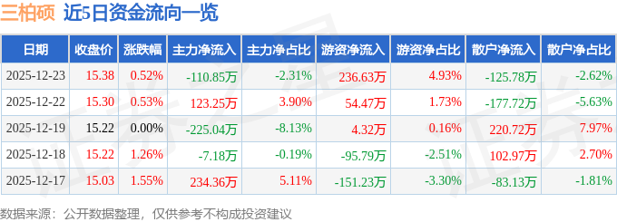 证券之星消息,截至2025年12月23日收盘,三柏硕(001300)报收于15.38元,上涨0.52%,换手率1.29%,成交量3.14万手,成交额4799.07万元。