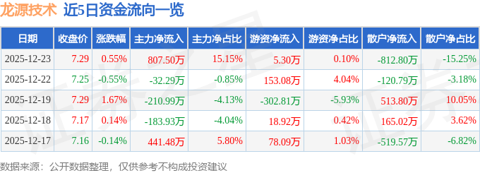 证券之星消息,截至2025年12月23日收盘,龙源技术(300105)报收于7.29元,上涨0.55%,换手率1.42%,成交量7.34万手,成交额5330.36万元。