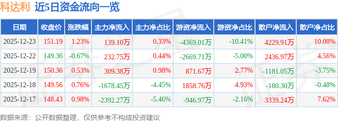证券之星消息,截至2025年12月23日收盘,科达利(002850)报收于151.19元,上涨1.23%,换手率1.41%,成交量2.79万手,成交额4.2亿元。