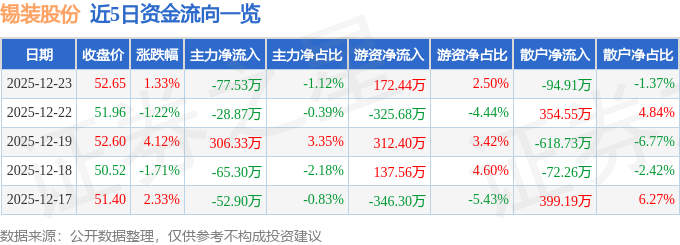 证券之星消息,截至2025年12月23日收盘,锡装股份(001332)报收于52.65元,上涨1.33%,换手率2.74%,成交量1.32万手,成交额6905.82万元。