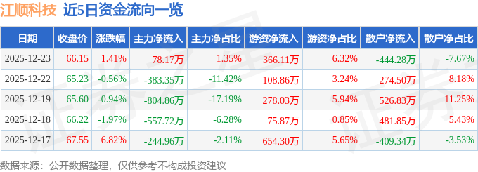 证券之星消息,截至2025年12月23日收盘,江顺科技(001400)报收于66.15元,上涨1.41%,换手率5.88%,成交量8813.0手,成交额5791.28万元。