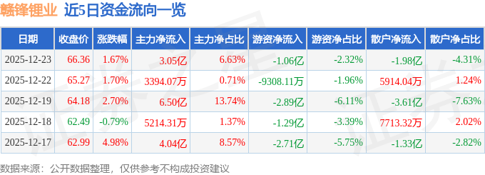 证券之星消息,截至2025年12月23日收盘,赣锋锂业(002460)报收于66.36元,上涨1.67%,换手率5.73%,成交量69.5万手,成交额45.96亿元。