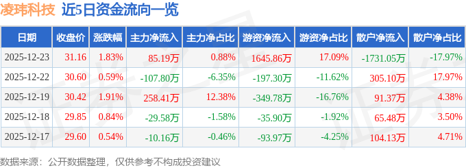证券之星消息,截至2025年12月23日收盘,凌玮科技(301373)报收于31.16元,上涨1.83%,换手率7.84%,成交量3.02万手,成交额9630.68万元。