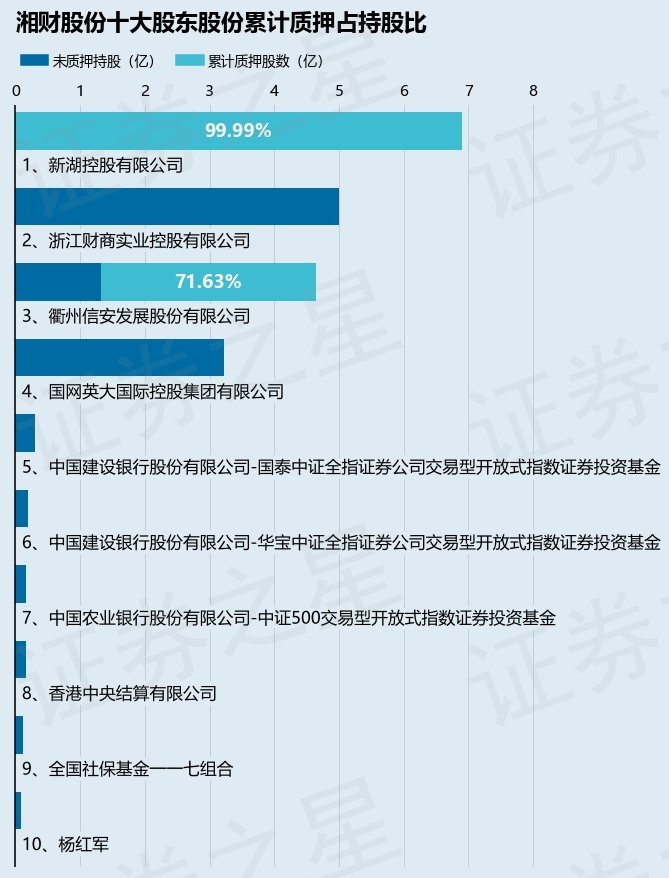 截止本公告日,股东新湖控股有限公司已累计质押股份6.9亿股,占其持股总数的99.99%,股东衢州信安发展股份有限公司已累计质押股份3.33亿股,占其持股总数的71.63%。本次质押后湘财股份十大股东的累计质押股份占持股比例(占持股比例的计算以公司最新一期财务报表公布的十大股东的持股总数为基准)见下图: