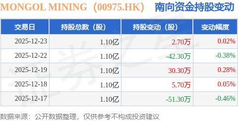 证券之星消息,12月23日南向资金增持2.7万股MONGOL MINING(00975.HK)。近5个交易日中,获南向资金减持的有2天,累计净减持54.9万股。近20个交易日中,获南向资金减持的有12天,累计净减持286.5万股。截至目前,南向资金持有MONGOL MINING(00975.HK)1.1亿股,占公司已发行普通股的10.54%。