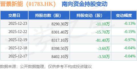 证券之星消息,12月23日南向资金减持11.1万股晋景新能(01783.HK)。近5个交易日中,获南向资金减持的有5天,累计净减持115.3万股。近20个交易日中,获南向资金减持的有12天,累计净减持142.1万股。截至目前,南向资金持有晋景新能(01783.HK)8290.3万股,占公司已发行普通股的2.86%。