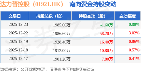 证券之星消息,12月23日南向资金减持1.6万股达力普控股(01921.HK)。近5个交易日中,获南向资金增持的有4天,累计净增持91.6万股。近20个交易日中,获南向资金减持的有11天,累计净减持41.4万股。截至目前,南向资金持有达力普控股(01921.HK)1985.0万股,占公司已发行普通股的1.31%。