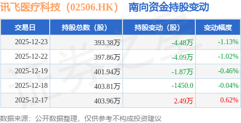 证券之星消息,12月23日南向资金减持4.48万股讯飞医疗科技(02506.HK)。近5个交易日中,获南向资金减持的有4天,累计净减持8.1万股。近20个交易日中,获南向资金增持的有13天,累计净增持1.61万股。截至目前,南向资金持有讯飞医疗科技(02506.HK)393.38万股,占公司已发行普通股的5.08%。