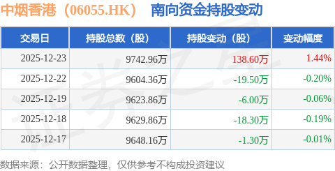 证券之星消息,12月23日南向资金增持138.6万股中烟香港(06055.HK)。近5个交易日中,获南向资金增持的有1天,累计净增持93.5万股。近20个交易日中,获南向资金增持的有9天,累计净增持92.1万股。截至目前,南向资金持有中烟香港(06055.HK)9742.96万股,占公司已发行普通股的14.07%。