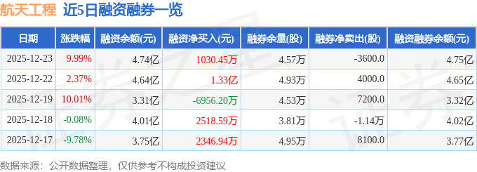 航天工程融资融券信息显示,融资方面,当日融资买入3.27亿元,融资偿还3.16亿元,融资净买入1030.45万元。融券方面,融券卖出2700.0股,融券偿还6300.0股,融券余量4.57万股,融券余额141.35万元。融资融券余额4.75亿元。