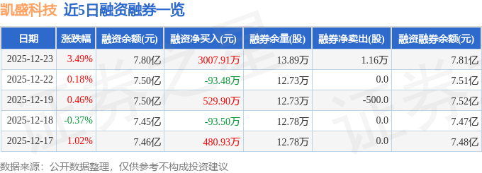 凯盛科技融资融券信息显示,融资方面,当日融资买入6378.68万元,融资偿还3370.77万元,融资净买入3007.91万元。融券方面,融券卖出1.16万股,融券偿还0.0股,融券余量13.89万股,融券余额156.54万元。融资融券余额7.81亿元。