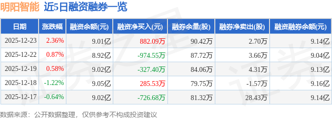 明阳智能融资融券信息显示,融资方面,当日融资买入8188.64万元,融资偿还7306.55万元,融资净买入882.09万元。融券方面,融券卖出5.21万股,融券偿还2.51万股,融券余量90.42万股,融券余额1293.01万元。融资融券余额9.14亿元。