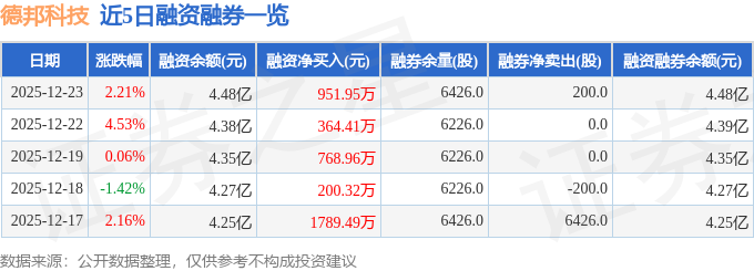 德邦科技融资融券信息显示,融资方面,当日融资买入3976.3万元,融资偿还3024.35万元,融资净买入951.95万元,连续3日净买入累计2085.32万元。融券方面,融券卖出200.0股,融券偿还0.0股,融券余量6426.0股,融券余额32.42万元。融资融券余额4.48亿元。