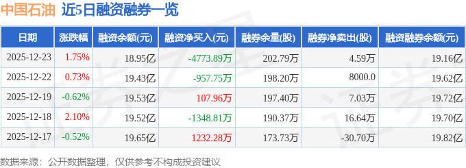 证券之星消息,截至2025年12月23日收盘,中国石油(601857)报收于9.89元,上涨1.75%,换手率0.07%,成交量105.38万手,成交额10.41亿元。