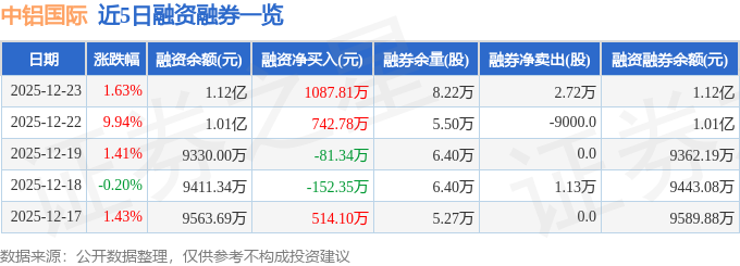 中铝国际融资融券信息显示,融资方面,当日融资买入3627.61万元,融资偿还2539.8万元,融资净买入1087.81万元。融券方面,融券卖出2.72万股,融券偿还0.0股,融券余量8.22万股,融券余额46.2万元。融资融券余额1.12亿元。