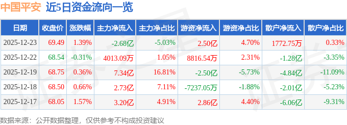 证券之星消息,截至2025年12月23日收盘,中国平安(601318)报收于69.49元,上涨1.39%,换手率0.72%,成交量76.57万手,成交额53.25亿元。