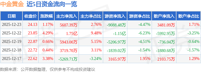 证券之星消息,截至2025年12月23日收盘,中金黄金(600489)报收于24.13元,上涨1.17%,换手率1.73%,成交量83.76万手,成交额20.32亿元。